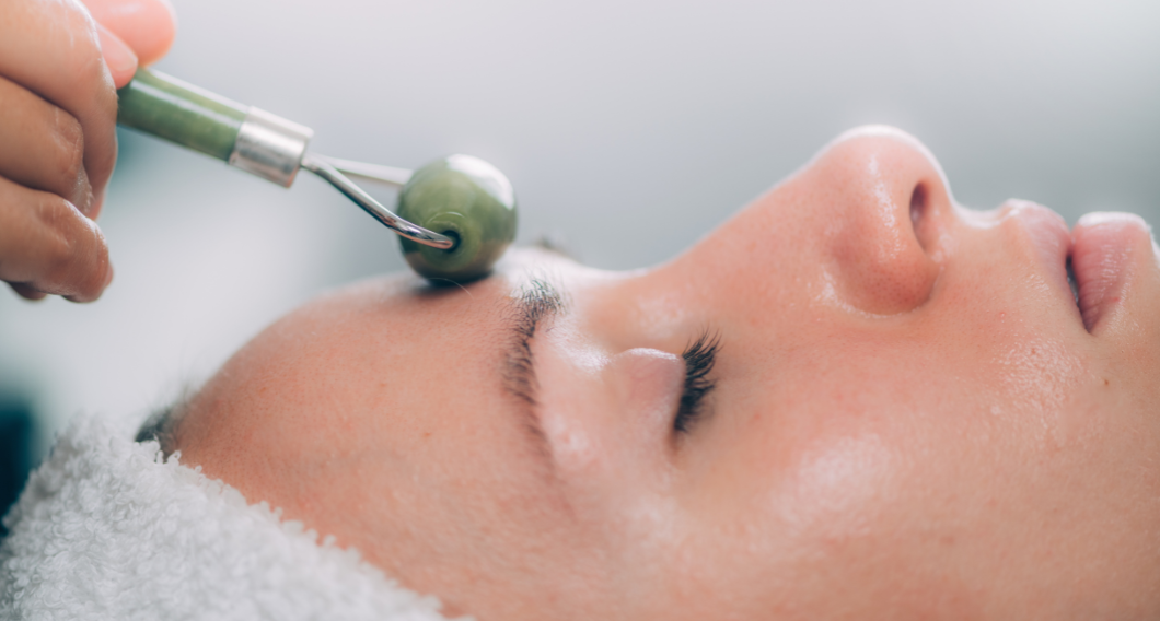 Lätt massage med jaderollern ger ditt ansikte en vacker lyster.